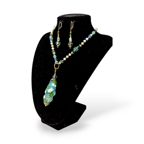 Designed so the pendant can be worn on a separate chain or worn on the beaded beckalace. Necklace can also be worn on its own. Pendant is glass floral bead with sterling silver findings. Necklace is faceted flourite, aqua crystals, aquamarine, pearls, rock crystal, dark green tourmaline, freshwater pearls and sterling silver clasp.