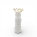 "The Crown Pawn explores transformation, humility and quiet power. Inspired by the chess piece that begins unnoticed yet hold the potential to become sovereign, this hand-blown glass sculpture features a soft milky translucence, rhythmic lattice texture and crown-like rim symbolizing ascension through persistence. A one-of-a-kind sculptural work celebrating inner rise."